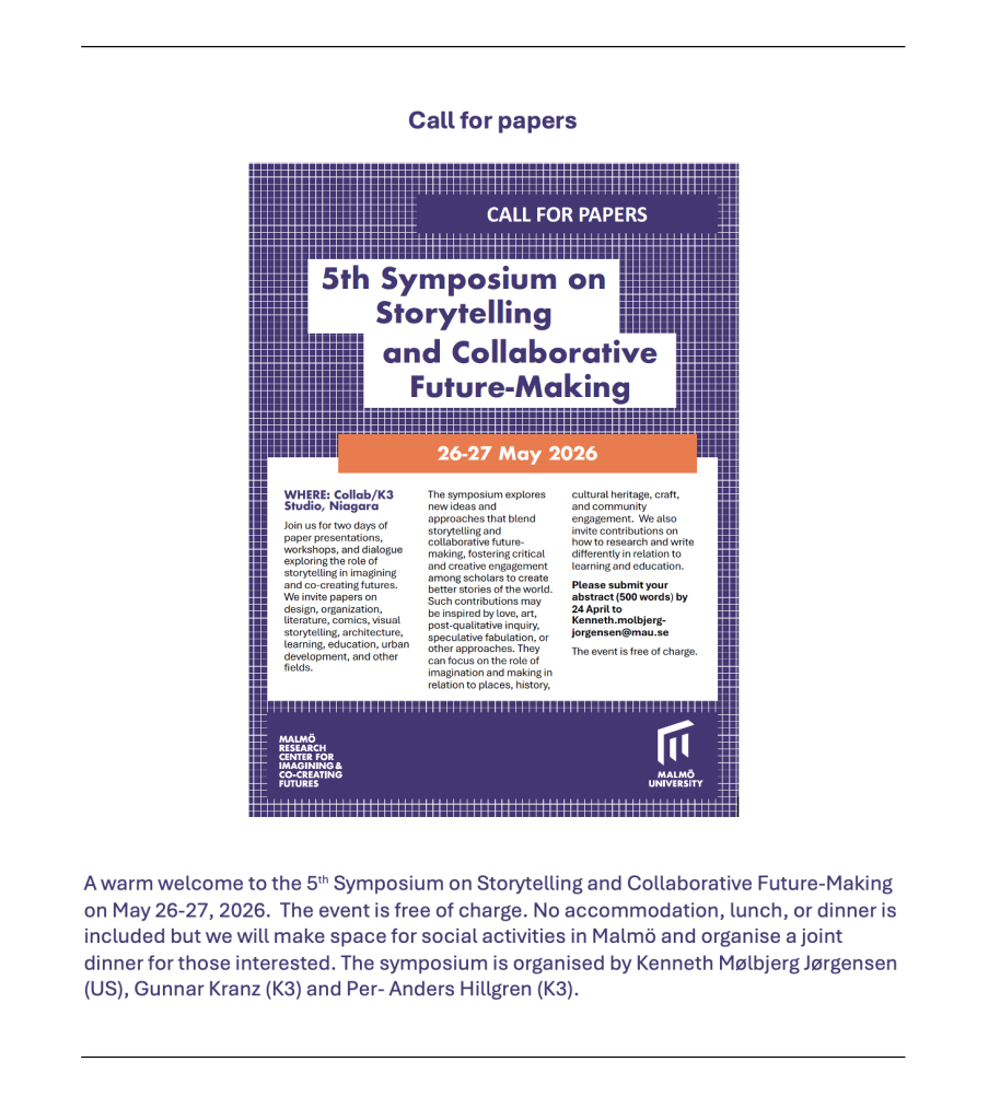 The Centre for Imagining and Co-Creating Futures hereby invites you to the 5th symposium at Malmö University, on the theme of storytelling and collaborative future-making. The symposium takes place 26-27 May 2026. We plan to construct a varied program with paper presentations, workshops, and spaces for dialogue. A common thread of the symposium is the exploration of storytelling’s role in imagining and co-creating futures. We invite papers on design, organization, literature, comics, visual storytelling, architecture, learning, education, urban development, and other fields.